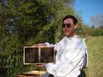Installing might as well be called dumping because that’s pretty much what you do to get the bees in the hive. Surprisingly, the bees are very docile when you dump them from the package into the hive. Once they establish their home in the hive, they are less docile. The package comes with a queen in a tiny little screened house that has a piece of hard sugar called ‘candy’ keeping her and a few worker bees inside. You use a rubber band to secure the queen’s little cottage to one of the frames inside the brood chamber and within 2-4 days the bees have eaten the candy and she’s let out to start laying. These packages are built by combining bees from different source hives and the queens are from yet another source so the idea is to introduce her slowly over a few days so she’s not attacked and killed. After you dump your bees in, fill their feeder with a mixture of sugar and water and put the lid on, you’re not supposed to peek for at least a week. During the Spring and Fall, the two hives are fed a 5 lb. bag of sugar mixed with water every week. In the Summer, they gather their own nectar courtesy of local flora to make honey. They get to keep one super of honey over the winter for their nourishment. Any honey above that first super is ours. In the Winter, you just leave them with whatever food they have stored because opening the hive lets the cold in, and bees like it toasty warm.