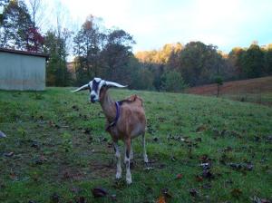 Mina was one of the first two goats to come live on Missing Willow Farm. We got her and a friend, Bellatrix LeStrange (Bella) from a dairy in North Carolina about three houres from here when they were just a week old and I bottle fed them. Cheese manufacturers want the milk from the moms, they are happy to send the kids to new homes. Mina is an alpine and nubian breed mix. She’s very mischevious. She always tries to follow me into the feed room, hoping to find some spilled grain or another treat that only she’ll be able to enjoy. The first photo was taken last Summer, the second was taken today. She’s obviously pregnant, the only question is with how many? Her nickname lately is Octomom. She’s a terrific milker and we’re looking forward to fresh chevre again.