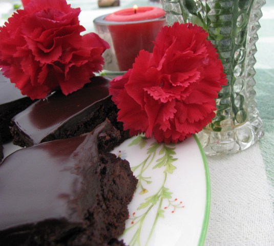Friends came over for lunch and a farm tour (who can resist lambs and kids??) the other day. Since my husband works from our living room, I entertained in the greenhouse. I made roast beef and boursin cheese sandwiches with buttercrunch lettuce right from our greenhouse bed, lemon pasta salad and avocado with blood orange vinegarette. My friend Kathleen brought a bottle of her homemade wine. My friend Lora brought chunky brownies with a ganache frosting that should be it’s own food group. She provided this photo. Don’t we know how to party in the middle of the week?