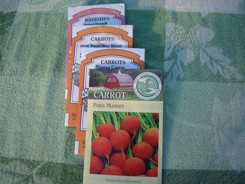 Carrots and radishes went into one of our raised beds this morning. I prepped another bed for peas. Those will be planted tomorrow. We’ve got potatoes on order, fancy ones. We only raise what we’ll eat ourselves and sell the remainder at the farmer’s market. No sense growing something we don’t enjoy. Folks around here in our small rural community are actually interested in trying unusual vegetables and love ugly heirloom tomatoes. We aim to please.