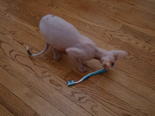 Bindi got into the upstairs bathroom again and procured the remaining toothbrush from the holder. We decided to let her have this one, hoping to spare ours if she ever clamps her eye on them in the master bath. She also procured a mousetrap (with a mouse) that we searched for days to find. Bad kitty.