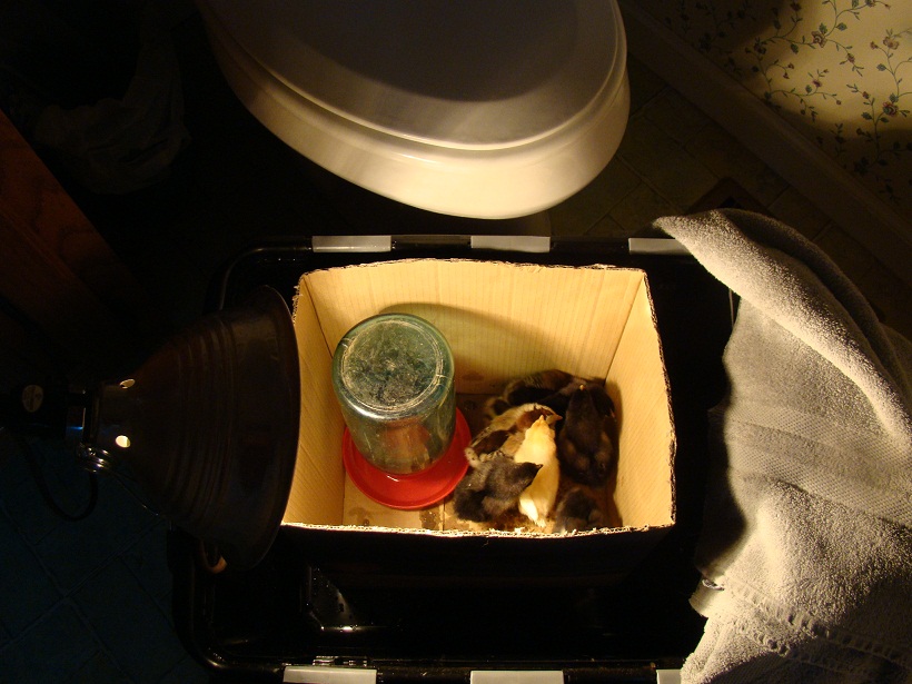 When we applied to become an Animal Welfare Approved farm, one of the requirements was to document a farm emergency plan. It seemed a bit much for a couple who considers themselves resourceful and who spent 10 years in the fire service but it was required so we did it. As it turns out, when we came in from chores this morning we discovered we’d lost power. It probably has something to do with the two inches of rain we’ve had in the past few hours. At any rate, the house has a generator and the barn doesn’t and that’s where our brooder is. So we ran out and put them in a box, grabbed an extra chicken light (you all have an extra one, right?) and brought them in the house. Yes, that’s a toilet in the photo. They were cozy in our spare bathroom with the door closed to keep the cat out!