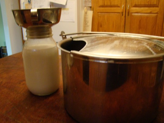 Hermione is an awesome milker. I’m getting close to a quart from her every morning. We let her spend the day with her buckling in the big pasture then move her over to the small pasture with the pregnant sheep and goats and Zeus and Xena for the evening. I milk in the morning after feeding chores and then she goes back to the big pasture for the day. My chevre recipe calls for a gallon of goat milk and feta calls for two. Looks like we’ll be enjoying cheese again really soon.