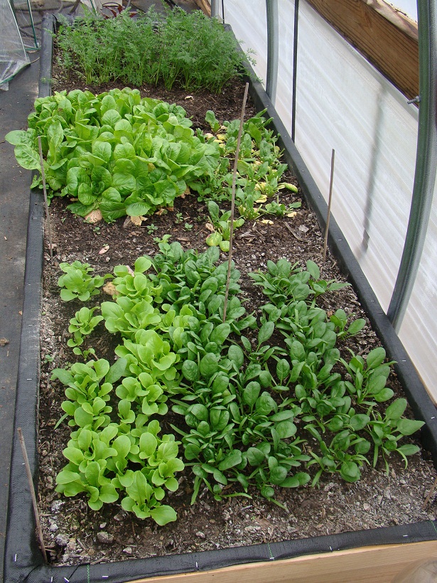 Lettuce, spinach, carrots and a few beets. That’s what we’ve got growing in our greenhouse bed. We haven’t fired up the heater yet, we’ve just been making sure everything stays watered. We’ve been eating from here all winter, and plan to quadruple the indoor garden space before next winter hits. This will become unusable when it gets consistently warm out. The greenhouse gets really hot inside during the summer. But it’s genius for growing cool season crops in the winter.