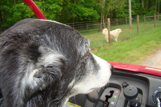 Jenna takes her spot between us in the Mule. Brian usually encourages her to run with us to the barn for some exercise (it’s about a quarter mile) but I like it when she rides with us. She’s not very good about sharing the seat. “Move over fat ass” comes right after “Load up, Jenna”. She completely ignores the squirrels and bunnies we scare up on the journey (they’re not large, white and fluffy like our sheep).
