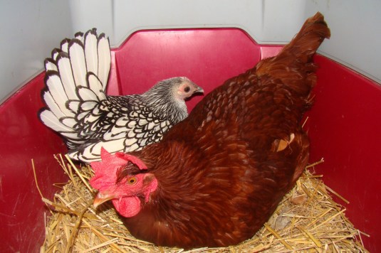 Nugget, our little Sebring banty chicken gave us about a half dozen eggs this year then stopped laying. She didn’t, however, stop sitting. She parks herself in our kitty litter/laying box and refuses to move… even when someone who actually is contributing to my egg carton shows up. As soon as Columbia, one of our Rhode Island Reds lays her giant brown egg, Nugget will settle in on it and wait for it to hatch. Since we kicked our mean roosters out of the barn, that won’t be happening. I’ve found her on as many as four eggs. When the Americaunas start laying, she’ll have to flatten herself out even bigger to keep them all warm until we can gather them.