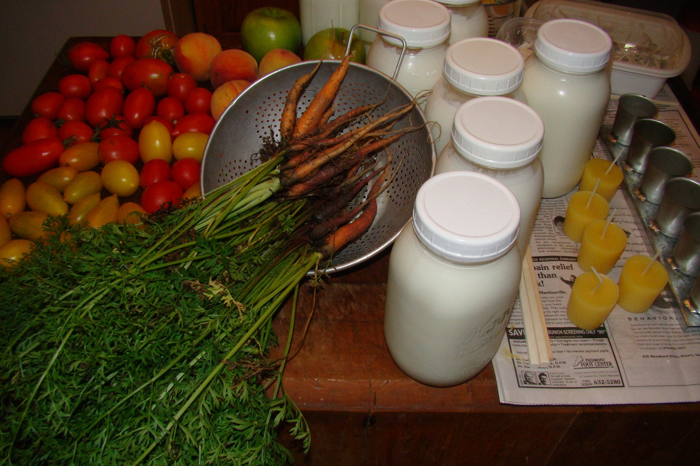 Sundays keep me busy. Today I canned plum tomatoes (I am canning about every other day right now to capture them at their peak), dried peaches and apples in my ancient Montgomery Ward dehydrator, pickled baby carrots, and made chevre from our goat milk and votives from our beeswax. I’m not counting the housework and twice a day farm chores in my accomplishments. What fun things did you do today?