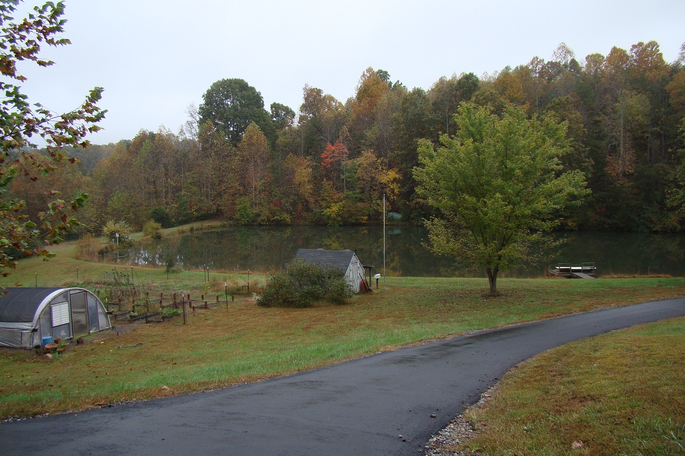 Autumn leaves won’t last long this year here in SW Virginia. I think we’ve hit our peak, a weak earlier than usual. We’ve had a few gloomy, rainy days which I love. This is the view from our front door. Greenhouse, raised beds, asparagus patch, playhouse complete with flagpole, satellite dish and mailbox (aka our garden storage shed) and our rowboat sitting on top of our dock neglected. We haven’t been for a boat ride in a while. I think we need to go fishing!