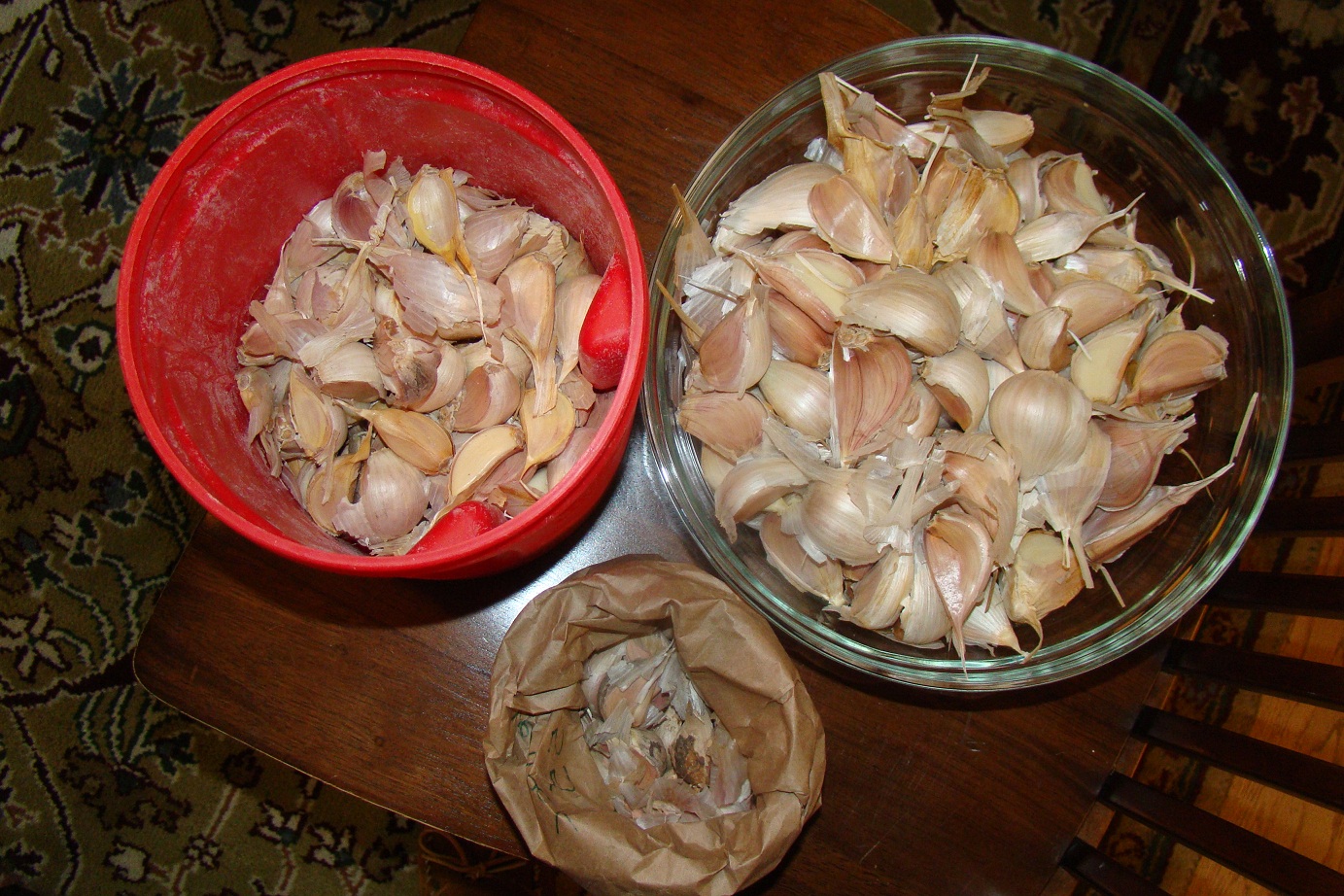 October is garlic planting month around here. We purchased some red chesnok (paper bag) and music (red container) seed garlic from a local farm that produces acres of the stuff every year. They specialize in garlic and raspberries, an odd combination. The giant cloves in the glass bowl were saved from our garden, and include our blue ribbon winning garlic heads from the fair last month. I don’t recall what kind it is, we save our own every year and only propagate the best. I got the easy job, which was breaking the heads into cloves. Brian did the planting. We’ve got three raised beds dedicated to this stuff, 100 plants per bed. You plant a clove of garlic then next June you harvest a head of garlic. If you’re in gardening zone 7, grab some garlic from your kitchen and stick a clove or two in the ground. Next Summer, you’ll be happy you did!