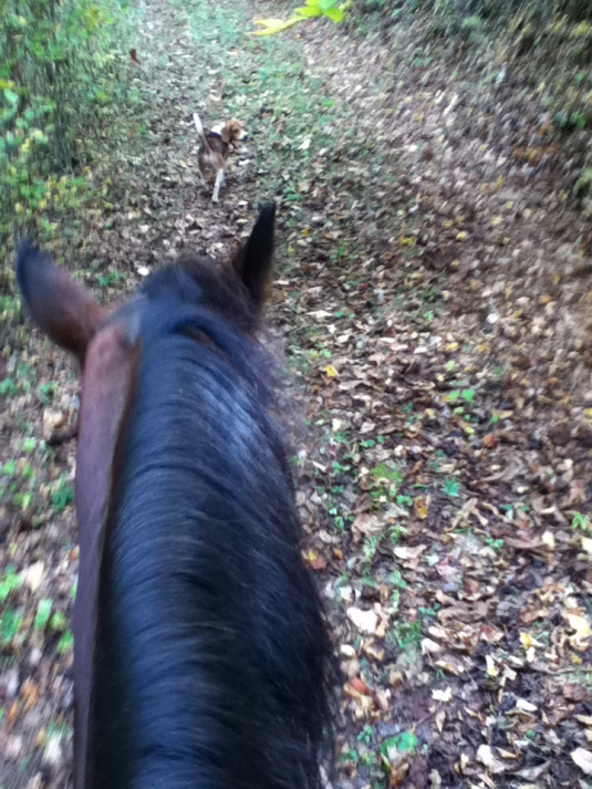 Horseback riding is something I haven’t done in 35 years. I had a chance to go last Monday on a beautiful trail in the company of friends and a beagle. Unfortunately, soon after I got this shot the horse took off and I came off. An emergency room visit confirmed I have no broken bones, thankfully, but still couldn’t lift my left leg. It’s been five days and I’m getting around OK with a walker. The hospital gave me an NSAID pain reliever prescription (dude… seriously?) Luckily we’ve got a stash of the good stuff from a 1999 surgery that’s still potent. Since my fall, we’ve added 11 baby chicks to the farm that I haven’t seen yet. As soon as I’m feeling up to a trip to the barn, I’ll post a photo. Can’t wait to see them myself!