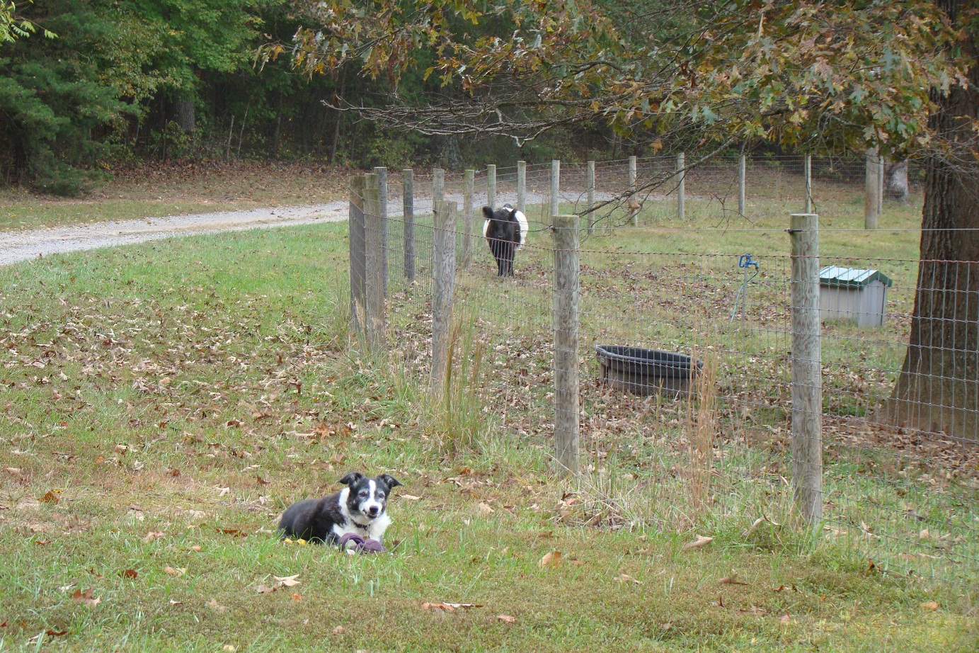 Haven’t yet made it out to the barn to see our new baby chicks, maybe this afternoon when my Aunt Carol and Uncle Lynn stop by for a visit on their big East Coast road trip. I did, however, find this photo from a week ago in my camera. Our beltie cow Jessica follows Jenna along the fence line whenever she sees her. It doesn’t matter which direction Jenna is going, Jessica lopes along until she catches up. She ignores the other dogs, it’s just Jenna she finds fascinating. They have the same coloring, maybe she thinks Jenna is a tiny calf who runs really fast?