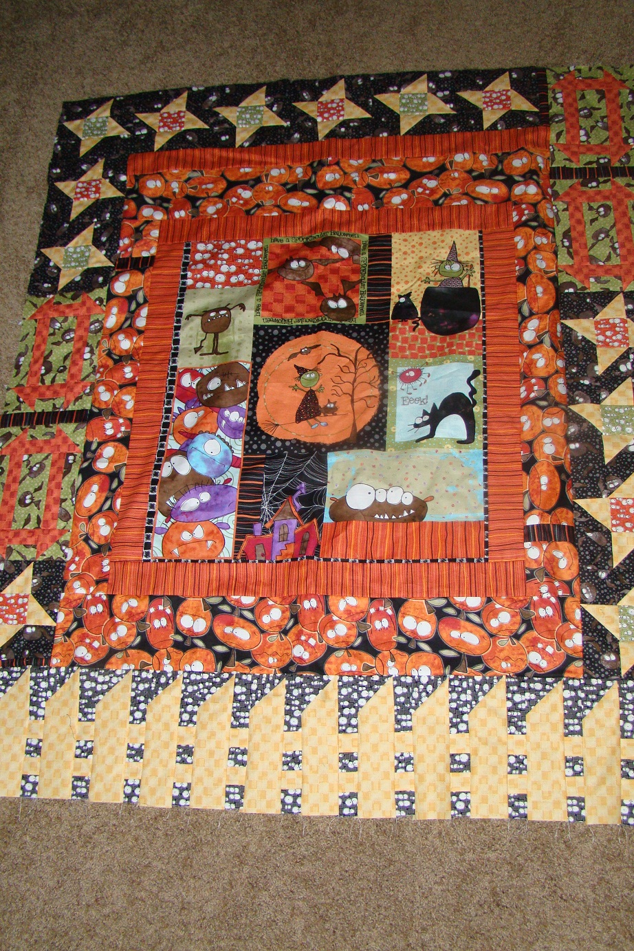 Halloween is tomorrow but my newest quilt won’t be done by then. I’ve finished piecing the top, though, and learned a lot of new techniques doing it. I still need to back it, bat it, quilt it and bind it. Maybe by next year.