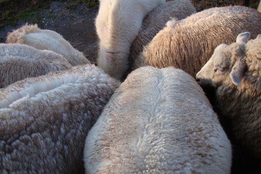 Feeding time for the sheep is in the morning. We’ve got them trained to come to a small fenced in enclosure for their daily grain ration. They’ve got two feeding troughs so there’s enough room for everyone to get in there and get their share. Sheep aren’t as friendly (or annoying) as goats so having them all in one place gives us a chance to handle them when needed. It looks like someone’s carrying twins!