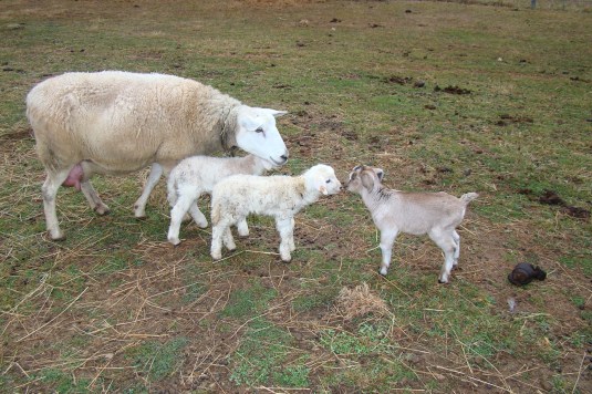 Nellie escorts her newborn lambs around the pasture to introduce them to everyone. One of Hermione’s triplets drops by to say ‘hey’.