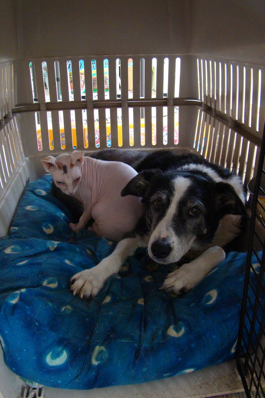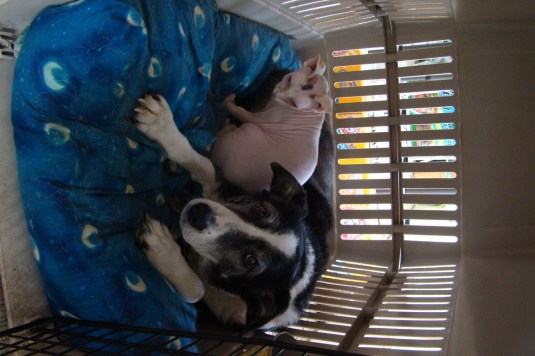 Jenna’s once again got Bindi intruding on her personal space, and doesn’t complain one bit about it. I think she enjoys the warm snuggly company. We kept her kennel closed for a long time after her surgery to keep Bindi from accidentally hurting her. Once we noticed that Jenna was actually laying on her bad side, we knew Bindi wouldn’t be an issue. We do, however, keep her kennel closed at night to keep Bindi’s food and our kitchen garbage can safe from mischief.