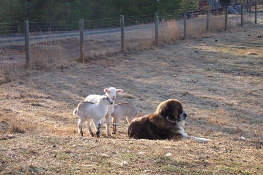 Lambs and kids gravitate to Milos, these three little girls like to be near him. They seem to know he’s their protector even though we’ve got such good fences that nothing harmful has never gotten in, thankfully.