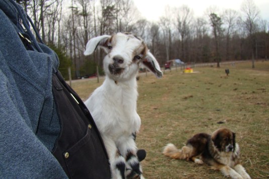 Summer won’t be this size forever, but for now she loves to be carried around like one of Paris Hilton’s pocketbook dogs. There are advantages to being raised by humans instead of goats. You get lots of attention!