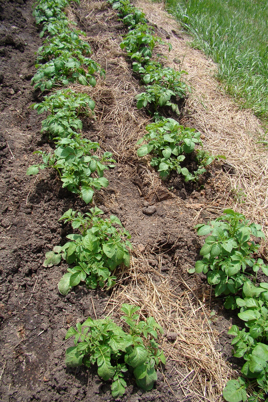 Every single potato we planted last month is up, and we still have a mess of seed potatoes in the fridge.  These were planted in a furrow and now that they’re up nice and tall, we mounded soil up around the base of the plant stems.  So instead of growing in a ditch, they’re now growing in a hill.  This is supposed to encourage even more tubers to develop along the stems so we’re hoping for a bumper crop this year.  I guess I could toss those seed potatoes, we’ll surely have enough of these to save for next year.  We added some squash to the bed yesterday and left some room to plant pumpkins.  They mature in 110 days so it’s a little early to plant for Halloween.