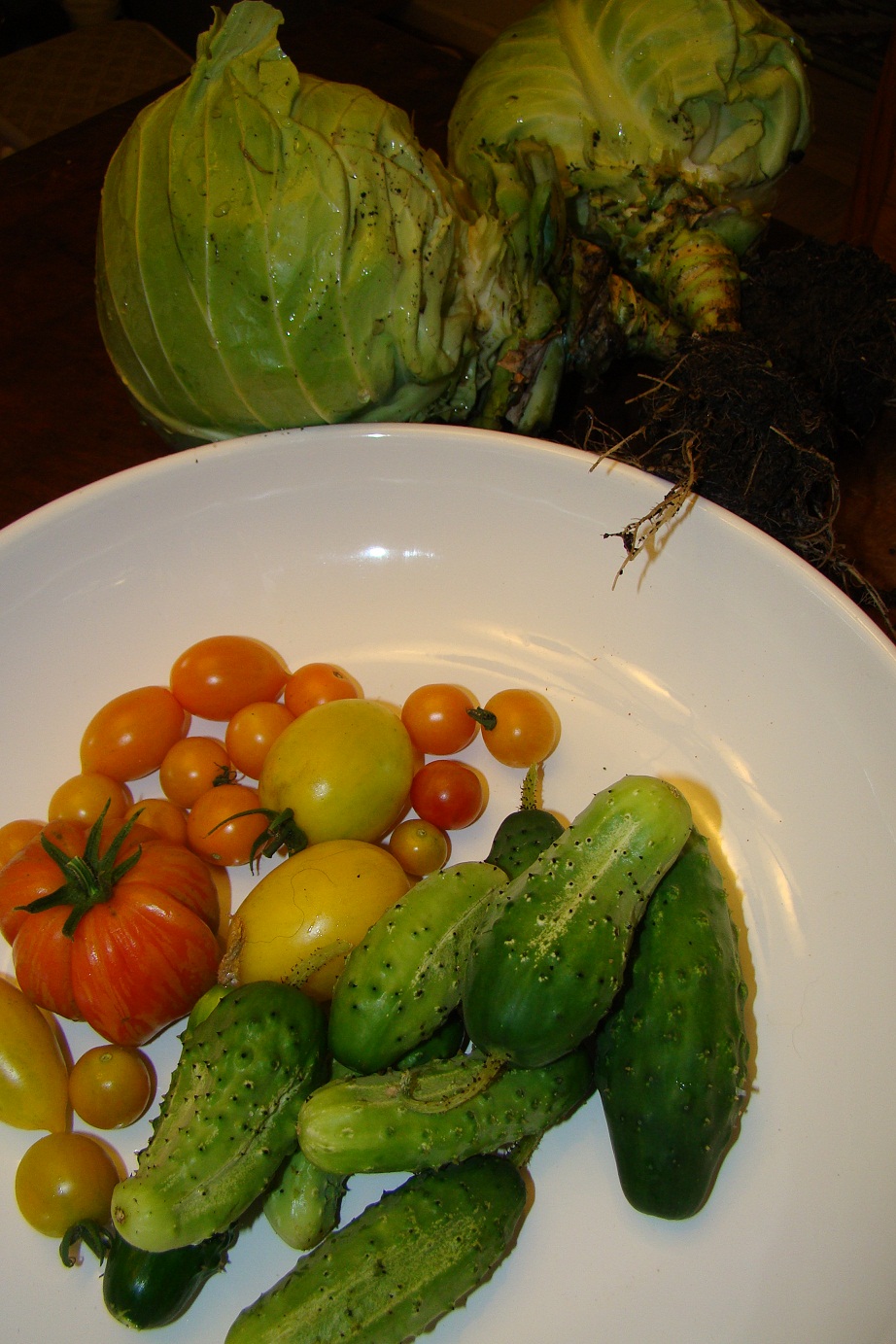 Cabbages, our first tomatoes and Snow’s Fancy cucumbers. I’ve already started making pickles. I’ve got two quarts put up so far which is good because we just opened the last quart of 2011 at dinner last night.