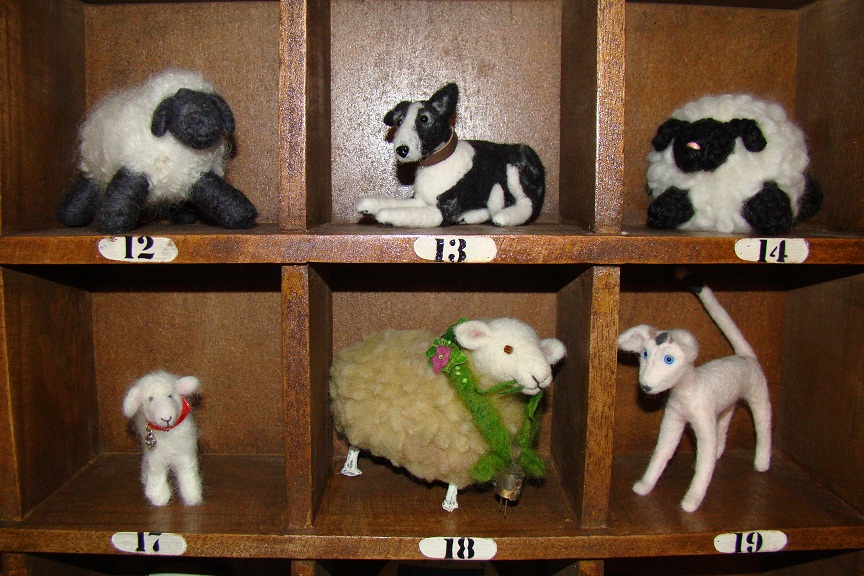 Just sharing some of my treasures. I’m responsible for none of these, they’ve been sent to me over the years in Craftster swaps by some really talented artists. That’s Jenna at #13, Beatrice at #18 and Bindi at #19. Those cubbies are 5″ by 5″, to give you some size perspective. How lucky am I?