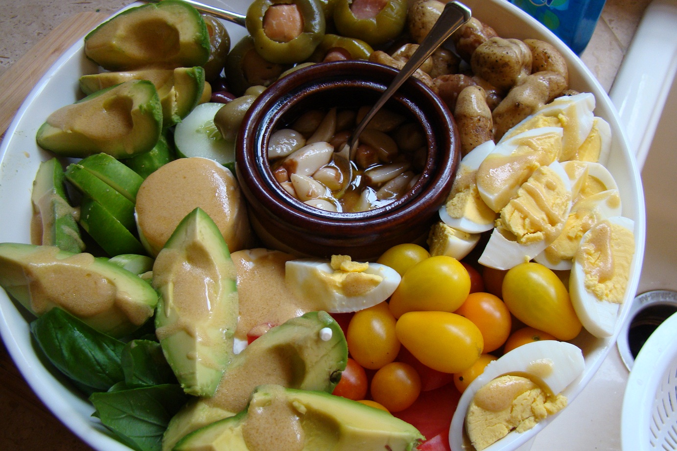 Here’s a sample of mostly farm fresh goodies all gathered for a side dish. Roasted potatoes and garlic, goat cheese, eggs, cucumbers and tomatoes all from our farm.