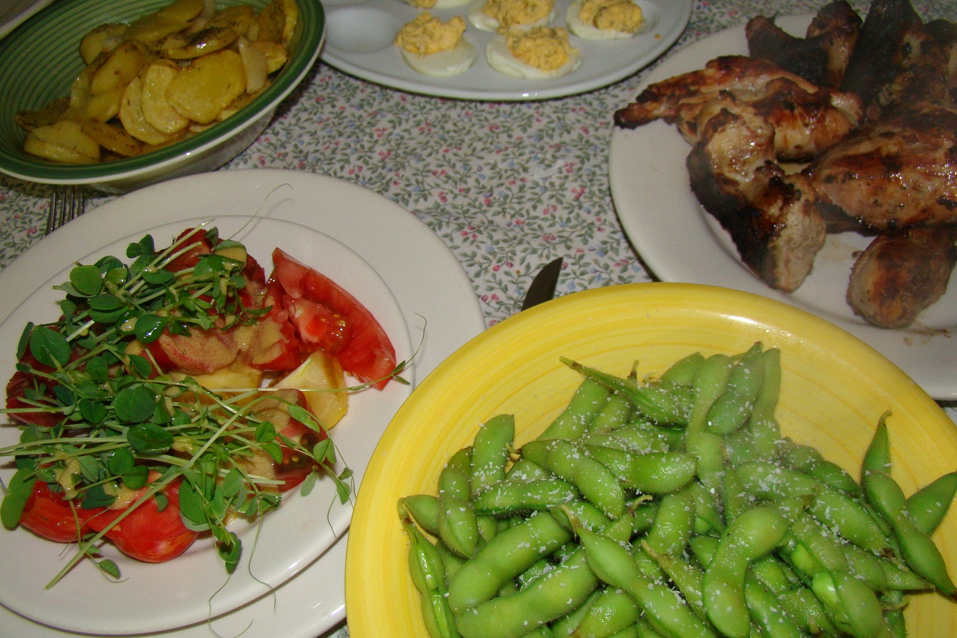 When we bought this place, we thought wouldn’t it be nice to feed ourselves? We’re there. For dinner last night, we had home grown pea sprout and tomato salad, roasted potatoes and garlic, deviled eggs, grilled chicken and edamame. We spend very little on groceries, we’ve got meat, vegetables and dairy taken care of. As an aside, I’ll be scarce this weekend as I’m managing a food event at a friend’s farm. Both of our girls will be rolling in to help, so we’ll have a nice family visit as well. I’ll be back early next week with photos.