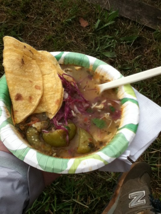 On Monday, chef Anthony Lamas treated us to an incredibly special breakfast of posole. It’s a pre-Colombian stew with hominy, tomatillos, chorizo, merguez sausage and a bunch of other yummy things. He served it with tortillas warmed on the grill and a bunch of toppings, including salsa, cabbage and lime. You may remember chef Anthony from the Wild Wedding episode of Extreme Chef. He was given $99 to cater a wedding from the 99 Cent store. He won. Our daughter Claire had the privilege of assisting him in the preparation a little bit. I love that volunteering at this event gives our children memorable experiences.