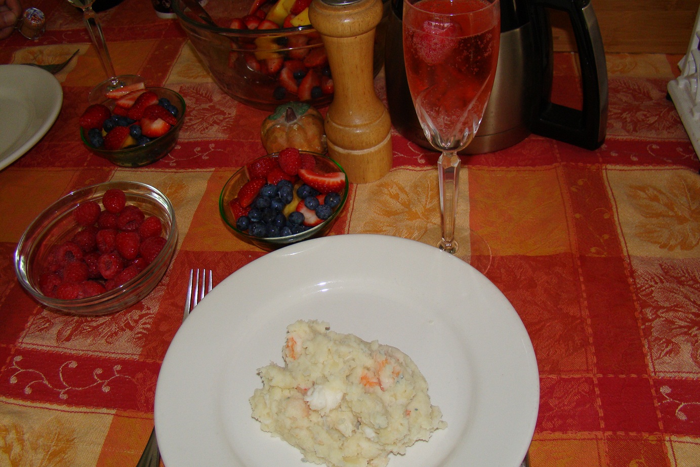 Lobster, shrimp and bleu cheese mashed potatoes, fresh berries, champagne and cranberry juice… and that’s breakfast! Our 25th anniversary was last week. Happy anniversary to my sweetheart!