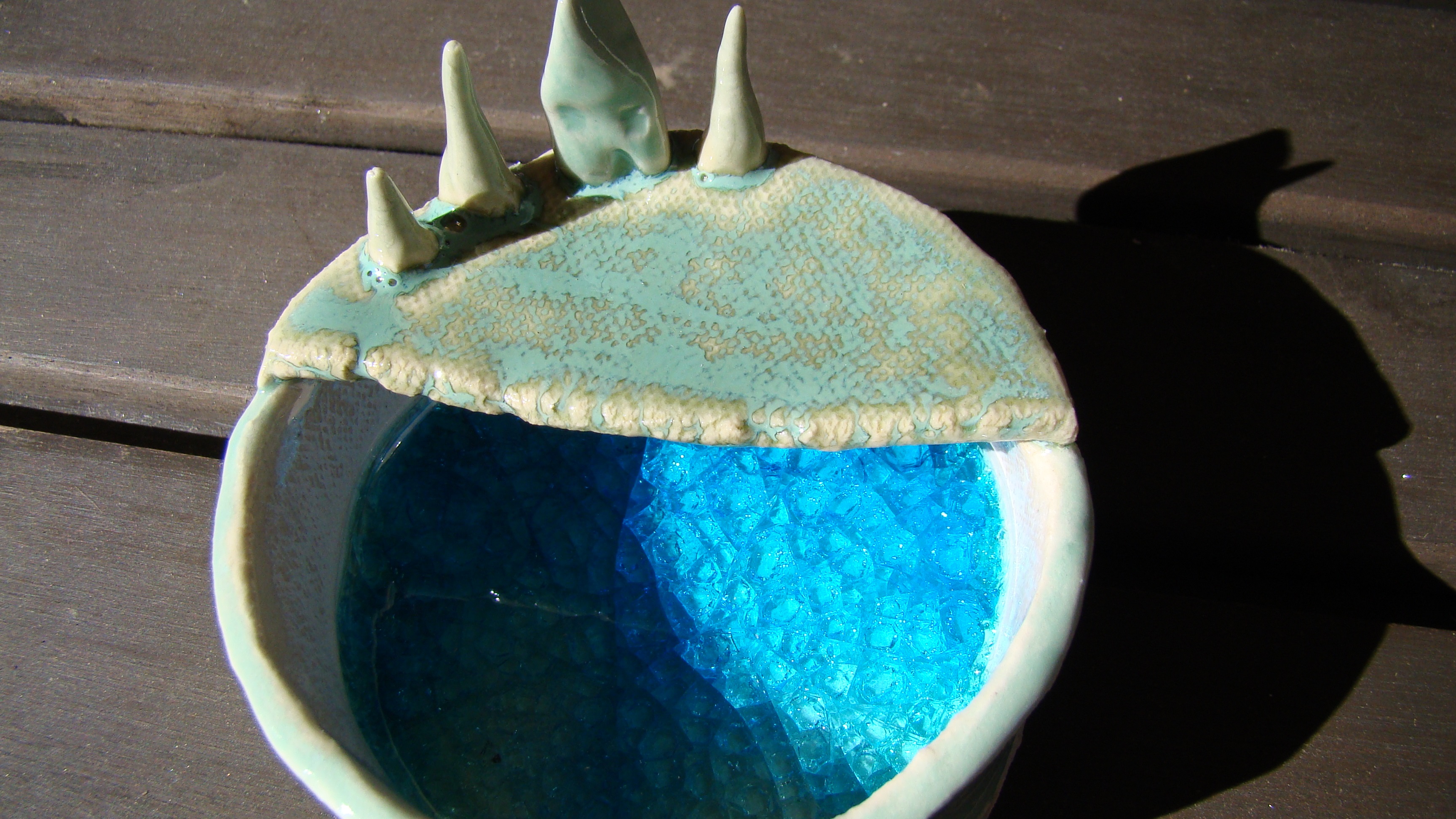 I’ve been playing with the terrazzo glass sampler I purchased a few weeks back. I made a few test vehicles (ancient engineering term) of pottery to try them out with. I learned that some glass chips hold their color better than others at the temperature we fire at. The little square dishes are ring holders. I didn’t use nearly enough glass in them but can refire with a little more. It seems the darker colors show the raised designs the best. The birdbath dish is just something silly I made. What I learned is this one also needs more glass (which I can fix with a refire) and since it’s a pinch pot, the surface is uneven. I’ll try adding glass to a wheel thrown pot soon. The last little dish was slab built and is my favorite. It’s like a tiny town at the side of a lake. Fun stuff!