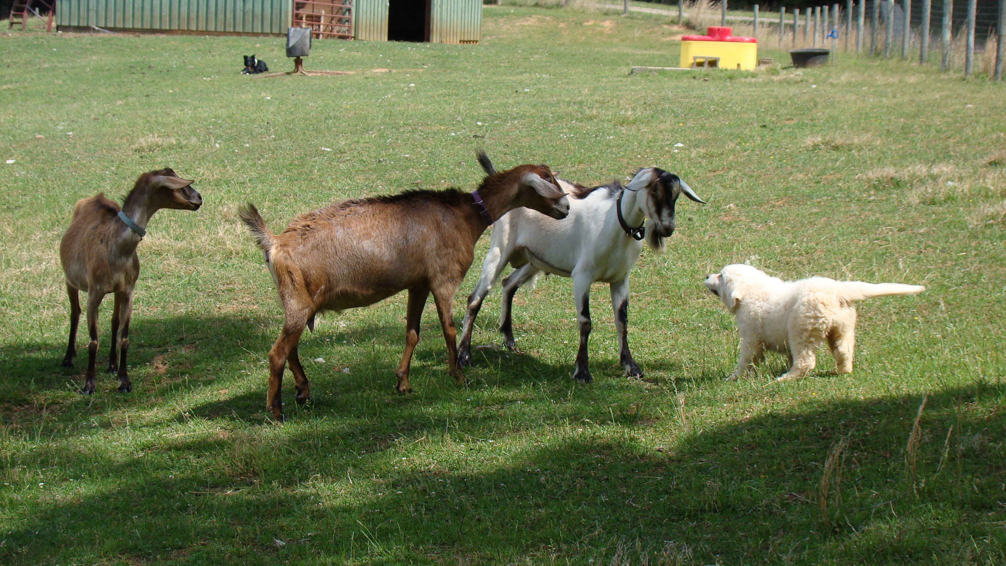 Our new buck Sam came home today. Hermione and Bella were very happy to meet him. We also moved Lizzie into the big pasture for the first time. I predict she will drive everyone crazy over there. 🙂 Jack, as per usual, relaxes in the background watching all of the fuss.
