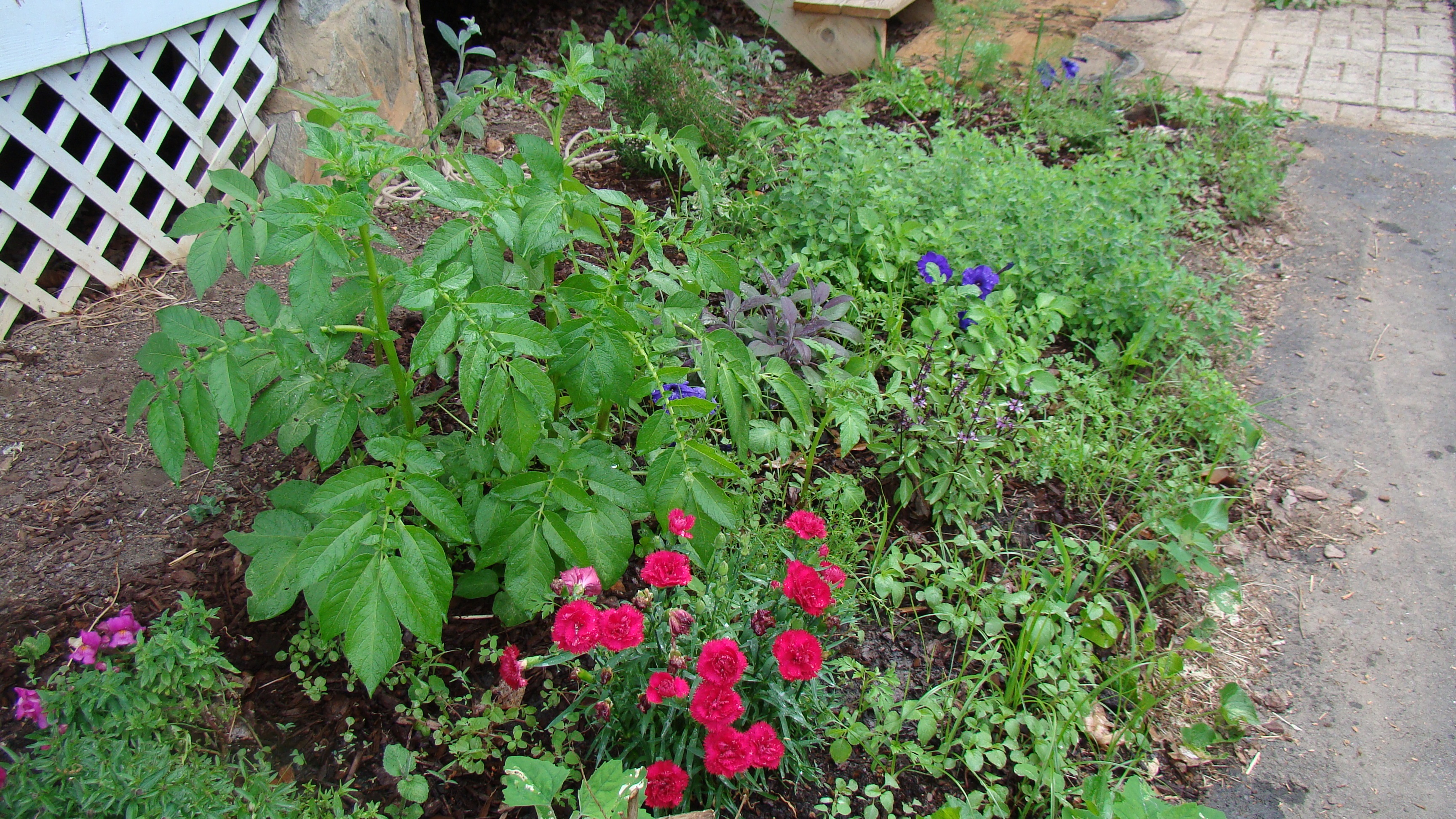 The largest plant in the flower and herb bed we put in next to the driveway is a volunteer potato plant. I guess I may have tossed a sub-standard potato in there last year after we harvested from the garden and it decided to live there. The trick will be can we get all of those potatoes out when fully grown? Otherwise, the same thing will happen next year. Not a bad problem to have.