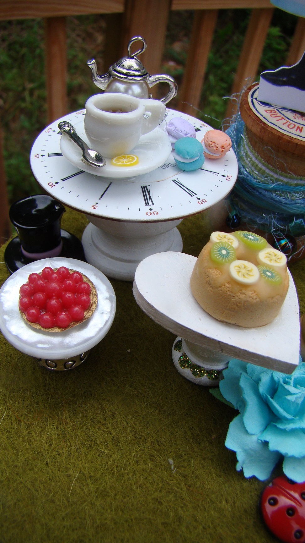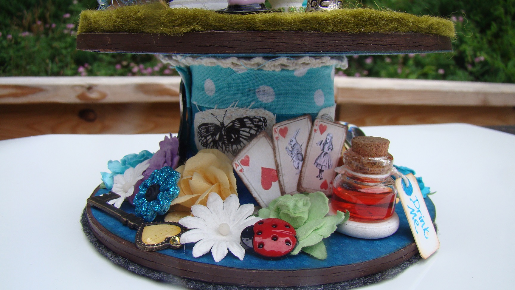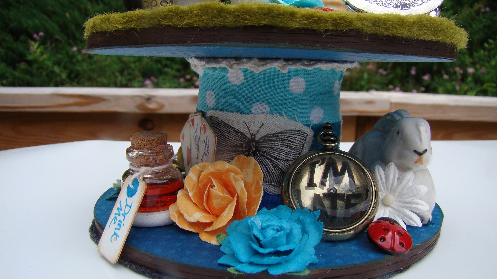 I am co-organizing an altered spool theme swap on craftster.org. It means you receive a partner’s information along with five different themes they enjoy. You choose a theme and decorate a spool to match. My partner had Alice in Wonderland near the top of her list so I was inspired to make a tea party. The base of the spool has a white rabbit, a ‘drink me’ potion, an “I’m Late” pendant, Alice playing cards, a key and keyhole and lots of flowers and ladybugs. Alice holds a timepiece on the top of the spool. The ‘Curioser and Curioser’ locket opens up to display the Cheshire Cat and White Rabbit. I made the cake and macaroons out of polymer clay. She was a lot of fun to make and I got to give it to my partner in person when she came for brunch this morning. Fun times!