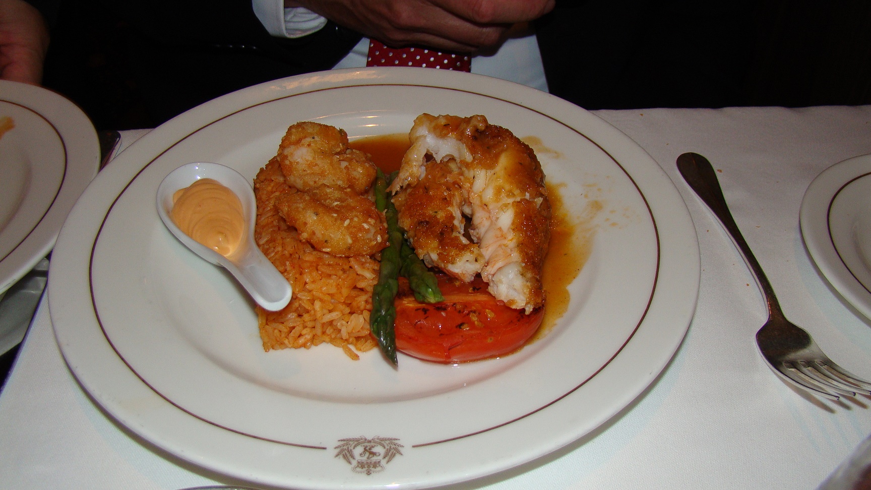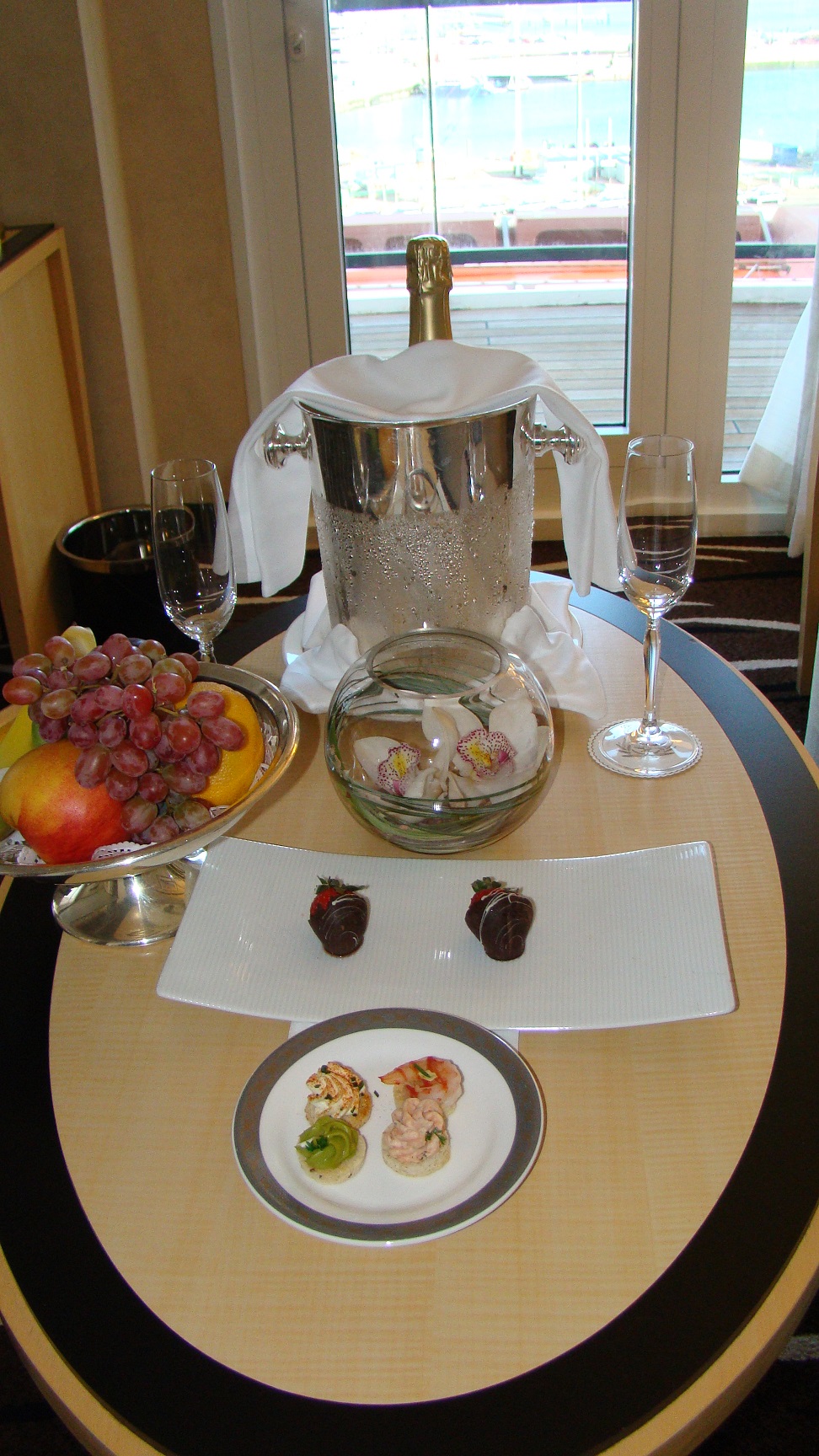 As I sort through all of the photos we took on our vacation, I’ll post a few here and there. We’re still working our way through a mountain of laundry. 🙂 In our cabin, we found a bottle of champagne, fruit basket, orchids, chocolate covered strawberries and canapes. A promise of a magical journey ahead! The sail away was very unusual for Cunard. The Queen Mary 2 usually sails at 5PM from Brooklyn but it was a particularly busy cruise embarkation day so we sailed from Manhattan just at sundown. It was a clear, warm, gorgeous night. We chose the late dinner seating so we would be able to experience our ship’s funnel passing just 10 feet below the Verrazano bridge. What a thrill!
