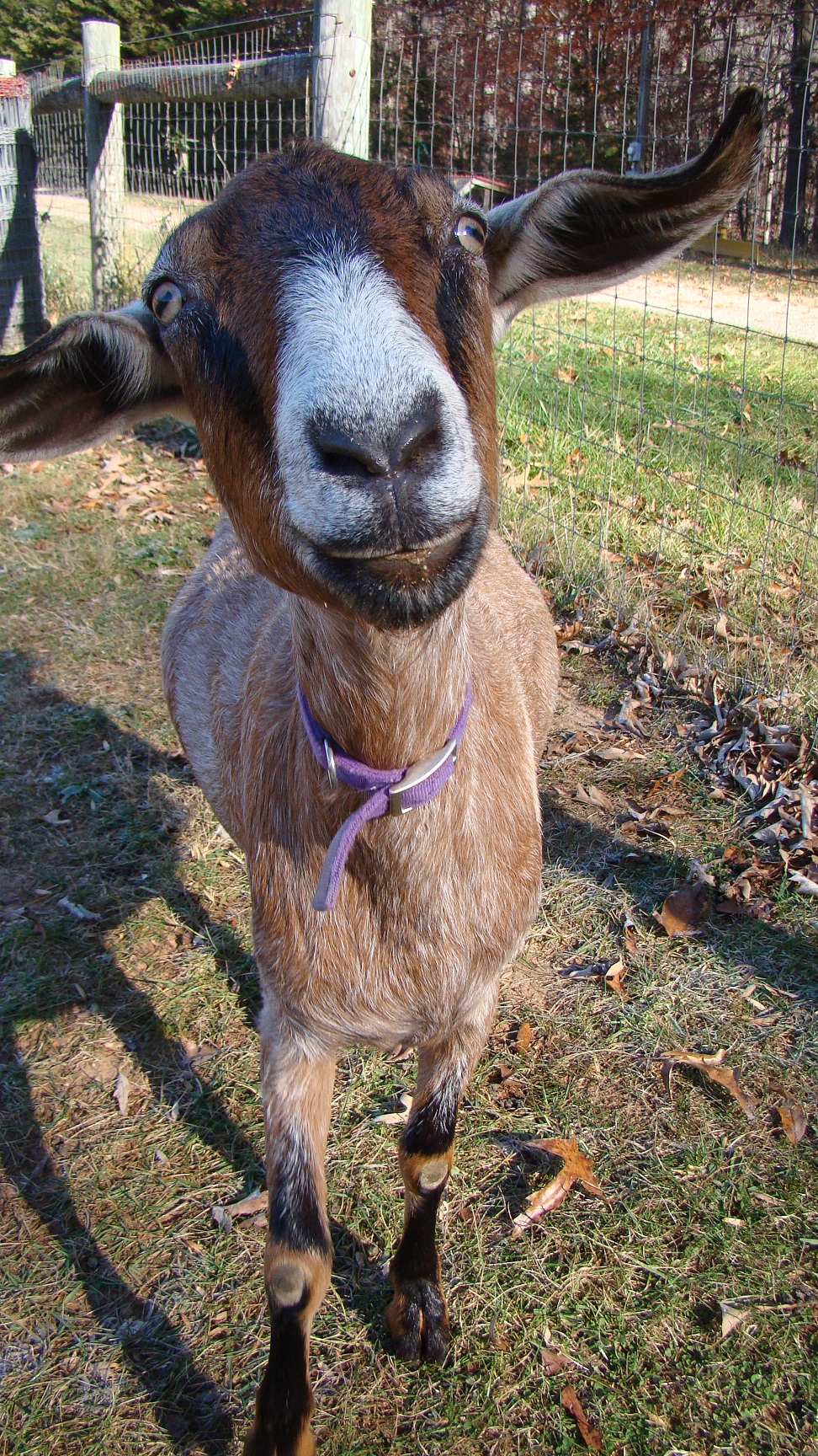 A very curious Hermione is checking out my camera. She’ll have a kid and be in milk soon (yay cheese!). She’s my best milker by far and stands quietly on the milking stand. And she’s cute.