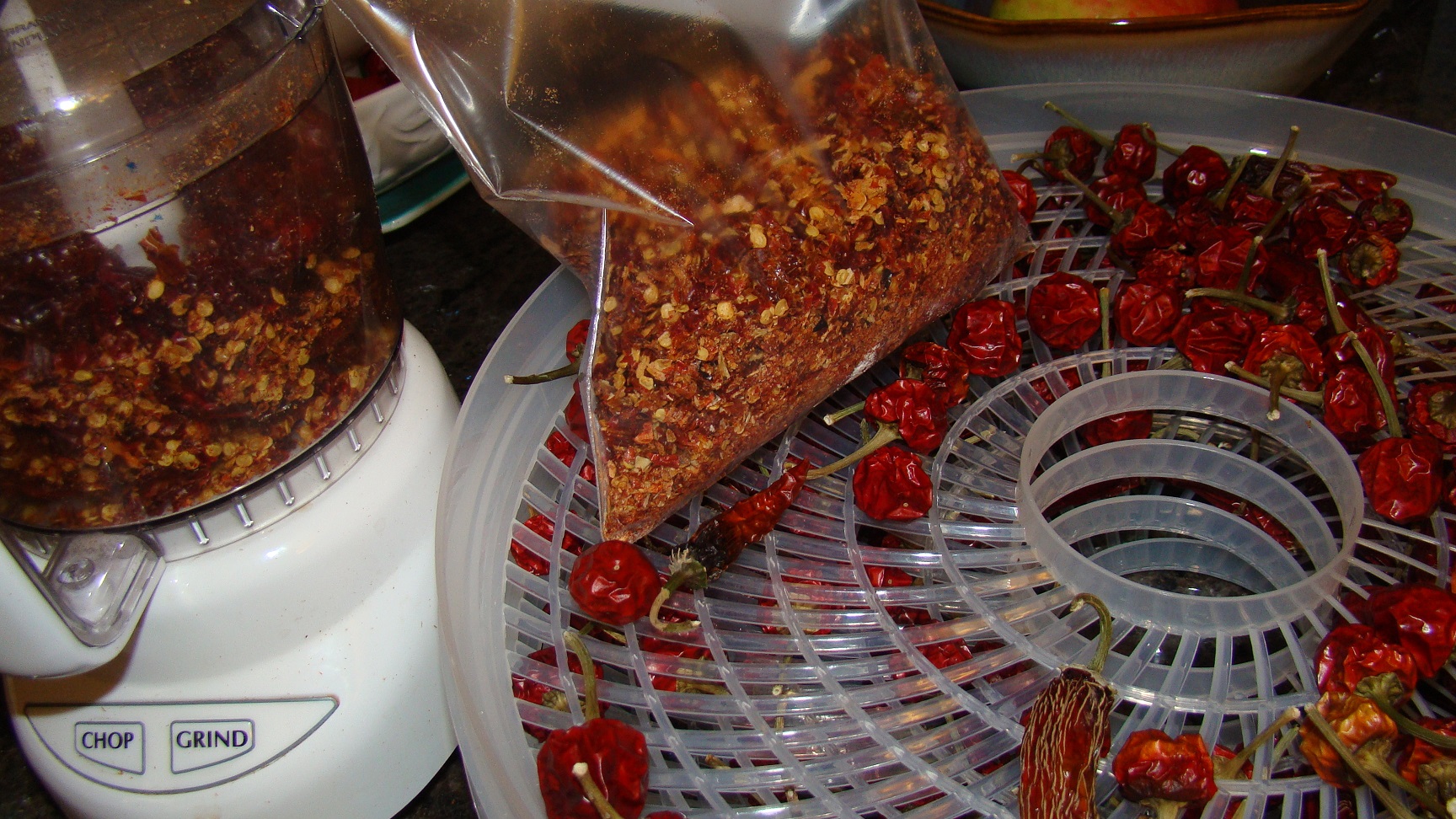 I finally got around to making our crushed pepper blend, using Joe’s Round, Joe’s Long, Red Carribean Habaneros and Ghost Peppers that we grew ourselves and dried in our food dehydrator. It’s crazy spicy and you don’t want to be anywhere inside our house on pepper flake day(!) A few years back I gave some to one of the chefs who is a customer of ours. Her husband is also a chef and decided to crust a steak with those flakes he found in the pantry while she was away on business. He called and asked her if she was trying to kill him. Ha!