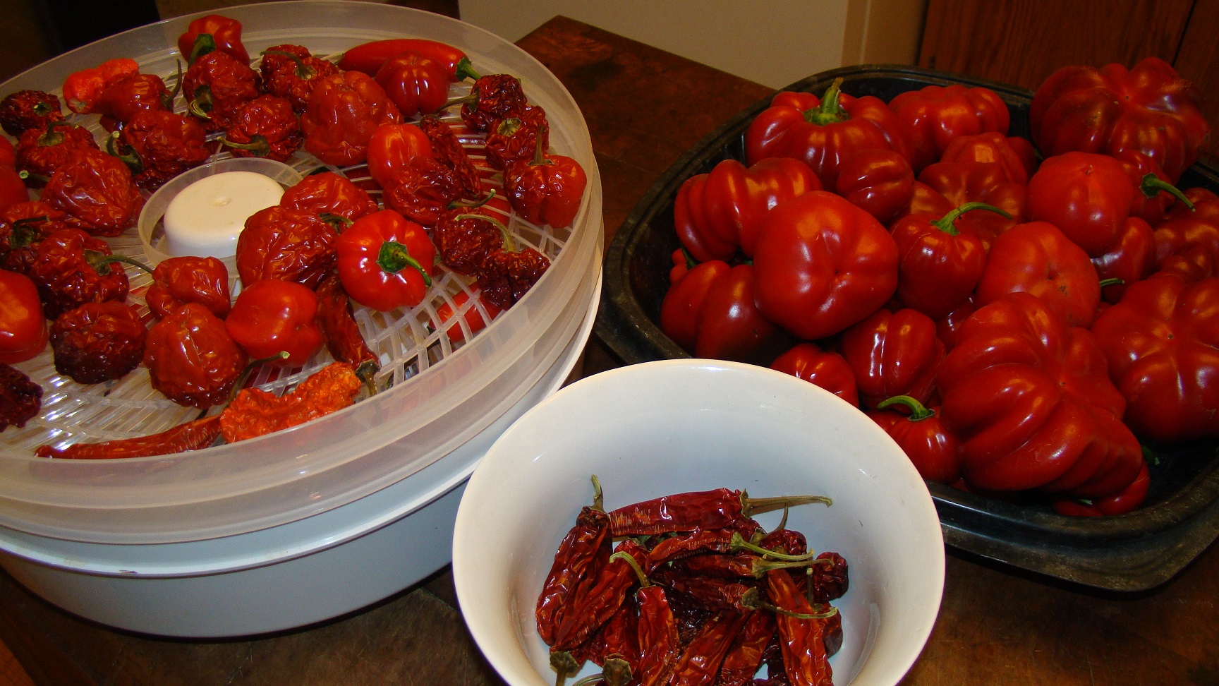The dehydrator is going pretty much 24×7 these days to process our hot pepper melange into our own special blend of hot pepper flakes. The house smells divine! We have a bumper crop this year. The largest peppers on the right are pimentos. Those are stuffed with cheese and roasted. I’m going to try to freeze a few stuffed ones to try this winter.