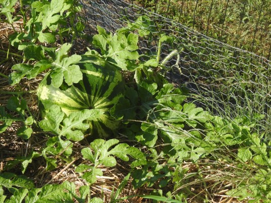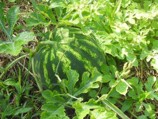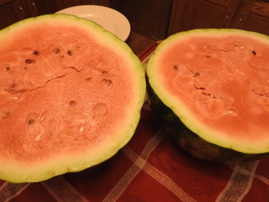 We plowed our potato patch a few months ago. Brian discovered a vine growing in it a few weeks later and soon two watermelons showed up, nicer than any melon we’ve ever grown ‘on purpose’. We decided to pick one and it’s fully ripe and totally delicious. The thing is, we didn’t plant watermelons anywhere this year. What a lovely surprise!