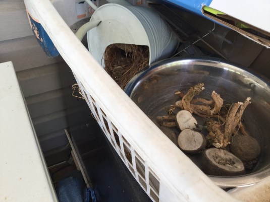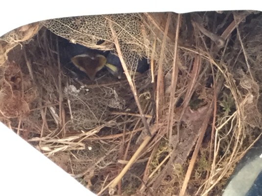 We’ve been watching a pair of small birds make a nest inside a watering can on our porch. They finally finished the big project and the female sat on a few eggs for way longer than I thought she would. I checked on her today and she wasn’t in there but three tiny birds were. It will be fun watching them grow up and fly away. I think that watering can will stay right there in case anyone else wants to use it. Guess I need a new one.