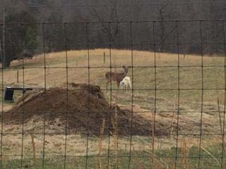 Jane Doe, our babysitting deer is back in the pasture hanging with our sheep and lambs. She has been joined by someone new, a skunk. We do smell skunks around the farm on occasion but this is the first time we’ve seen one out and about. It seems to like our place and has found a spot out by the barn to settle in, dang it. I chased five deer from our back yard this morning and our garbage can was raided by raccoons last night. Bears have been spotted in our neighborhood. It must be that time of year.