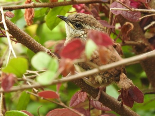 But three years ago a Carolina wren built a nest inside it and that was that. Every year she comes back to the nest she built. This year she laid more eggs than ever and when they hatched we got to watch her bring dead bugs to them. Since it’s right outside the kitchen window I happened to catch the babies venturing out for their first flights and grabbed a camera. If mom or one of the babies comes back next year, the nest will be there. It belongs to them.