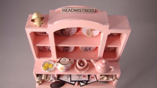 Here’s a Harry Potter inspired miniature featuring one of the series’ all time villains – Dolores Umbridge (lover of cats and all things pink). It was made from a Gypsy Soul Laser Cuts 3 panel hutch. Details can be found at http://gslcuts.blogspot.com/2020/06/dolores-umbridges-office-cupboard.html