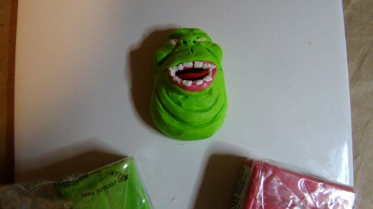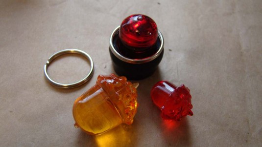 I fretted over how to make a red light working only from stash then found a jar of these vase filler acorns. When you set a red one inside a polymer clay base and add a split key ring, I think the effect is quite convincing.