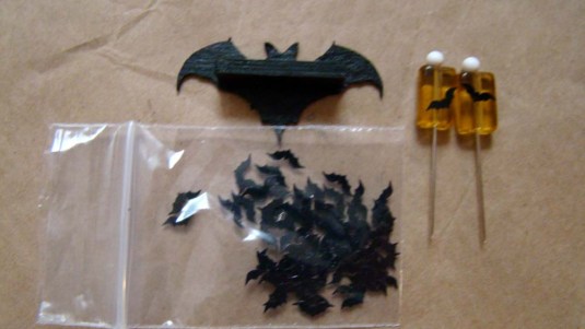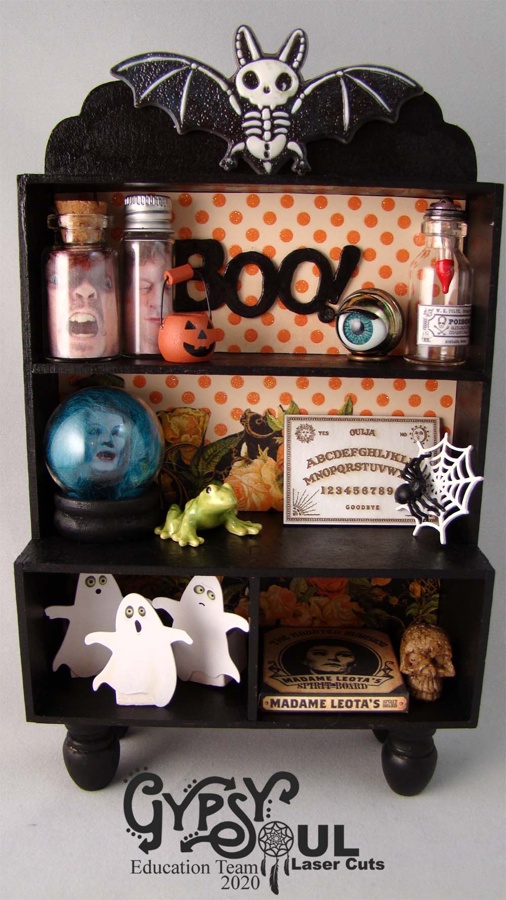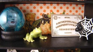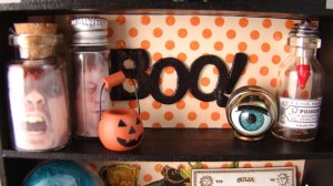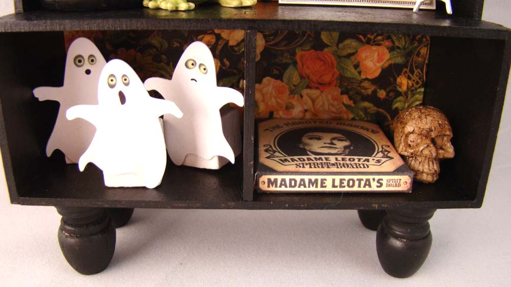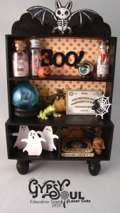 The niche needed a bat shelf so made one out of one of the Chipboard Bats Set and a small section of bass wood. Sitting on the shelf are some jars I made from Amber Glass Beads, round head pins and some tiny bats that were included in the October kit.
