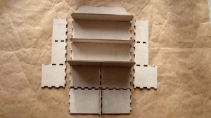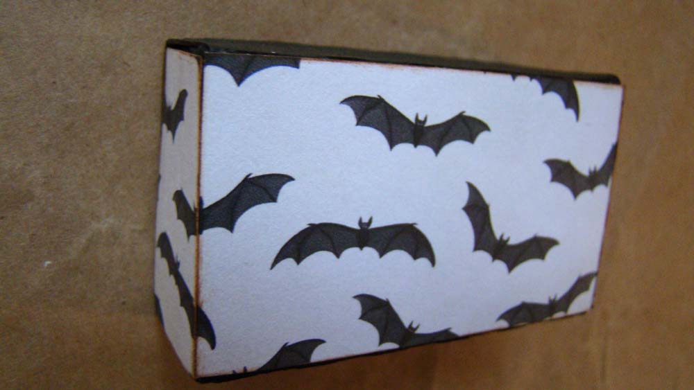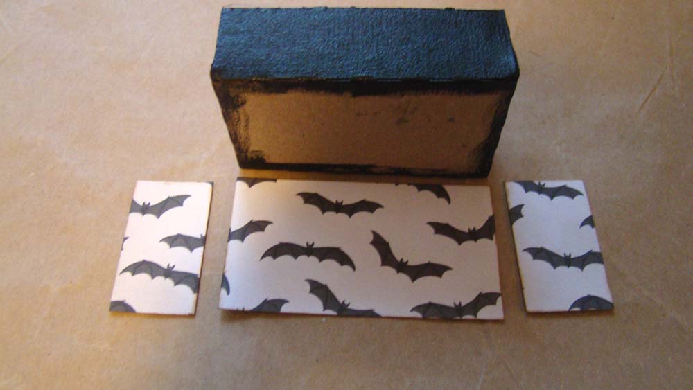 The counter is a chipboard box that gets folded up and glued together. I chose to paint the top black and paper the sides with this great bat paper.