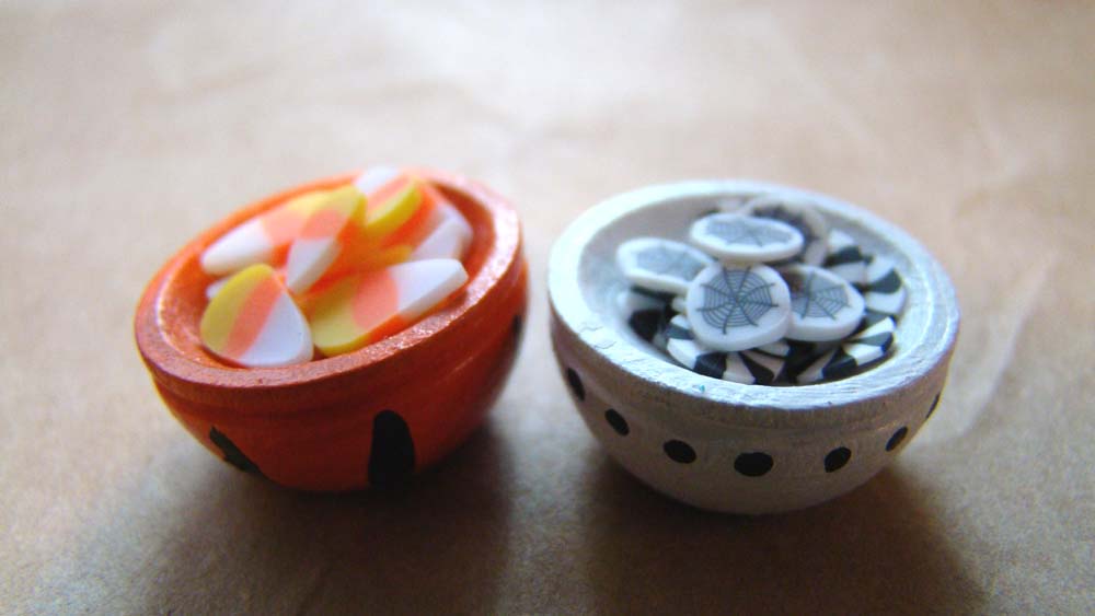 For the counter top I painted a couple of Tiny Wooden Bowls and filled them with more polymer clay slices.