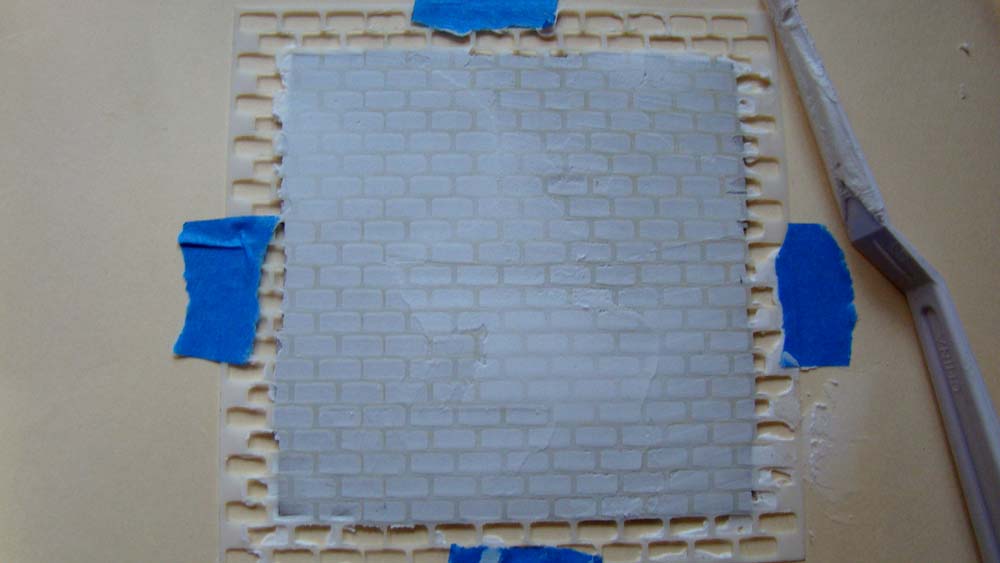 I started this project by making a platform from a House Ornament Base and a Small Brick Wall Stencil. After stabilizing the stencil with painter’s tape, I applied texture paste with a palette knife.