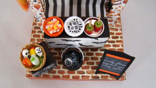 The candied apples are made from green polymer clay that got some brown and red chalk highlights after it was baked off. A toothpick stick was glued in place and they were dipped in a mixture of red acrylic paint and Glossy Accents.