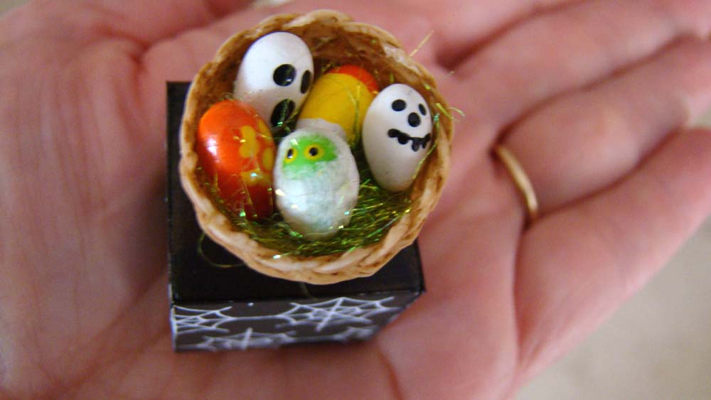 When my girls were little, we used to decorate blown eggs for Halloween. That inspired me to make some in miniature from polymer clay. They are displayed in a small basket on top of Mini Easter Basket Grass. I’ve set it on top of a decorated One Inch Wooden Block.