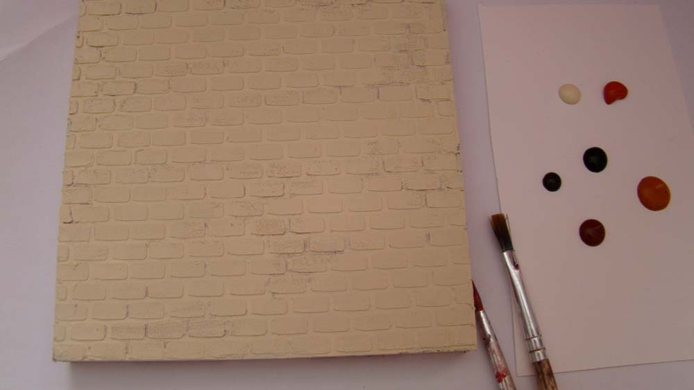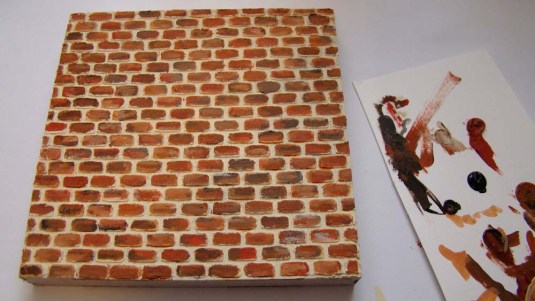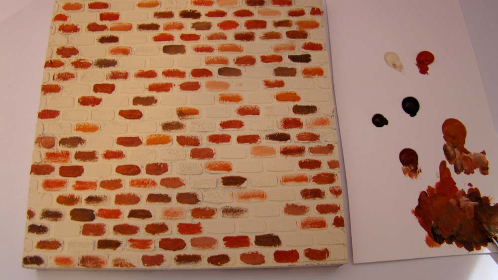 From there, I just randomly layered different shades of brown and orange paints onto the raised bricks.