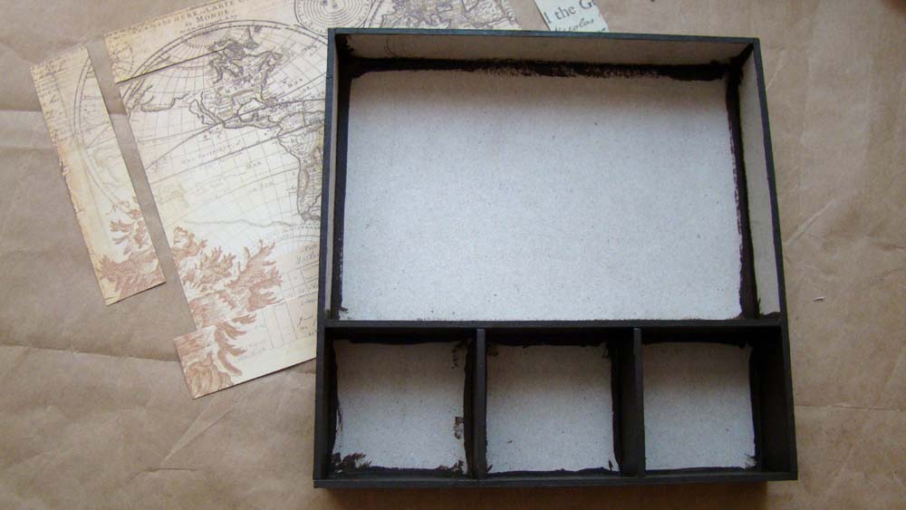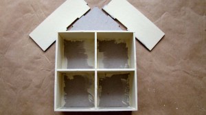 After assembling the interior, side walls and bottom of the piece using tacky glue, I painted the cubby walls and front edges with off white acrylic paint. I also painted the interior surface of the roof pieces the same color.